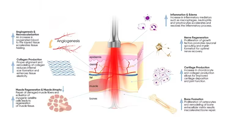 Accelerated Tissue Repair and Cell Growth Photons of light from lasers penetrate deeply into tissue and accelerate cellular reproduction and growth. The light increases the energy available to the cell so that the cell can take on nutrients faster and get rid of waste products.